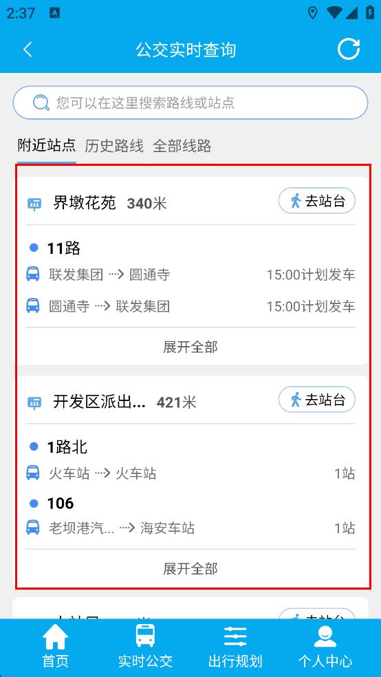 2、在公交實時查詢頁面,可看到附近站點(diǎn)等信息,找到自己想查詢的公交線路,點(diǎn)擊該線路,進(jìn)入線路詳情頁面。