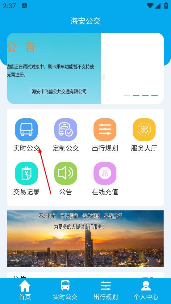 1、打開海安公交軟件,進(jìn)入軟件首頁,在頁面中找到標(biāo)有“實時公交”字樣的圖標(biāo),點(diǎn)擊該圖標(biāo),進(jìn)入公交實時查詢頁面。