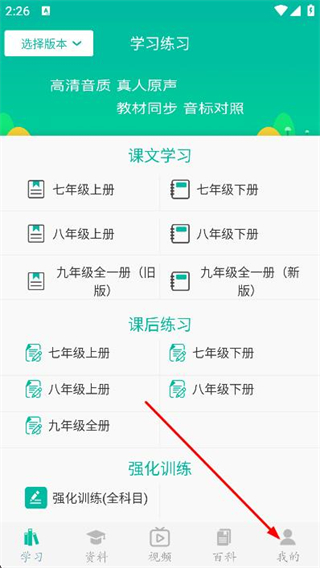 (1)包含七年級到九年級的單詞和課文(同步翻譯),且都配有高清的真人發(fā)音,可跟讀、可點讀。