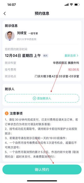 3、進入預約信息頁面后,添加就診人信息,點擊確認預約完成掛號操作。
