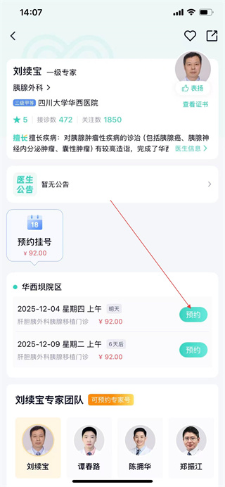 2、在醫(yī)生詳情頁的預約掛號區(qū)域,選擇目標就診時間,點擊對應的預約。