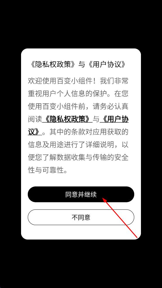 1、打開百變小組件App,彈出隱私權(quán)政策與用戶協(xié)議提示框,仔細(xì)閱讀后點(diǎn)擊“同意并繼續(xù)”,進(jìn)入到應(yīng)用主界面。