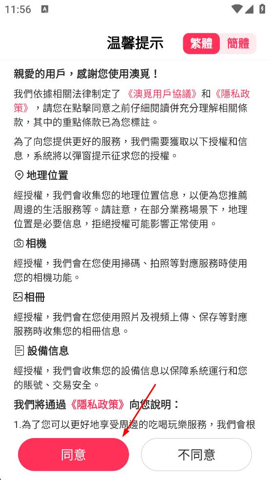 1、打開澳覓APP,出現(xiàn)溫馨提示頁面,仔細(xì)查看后點(diǎn)擊“同意”按鈕。