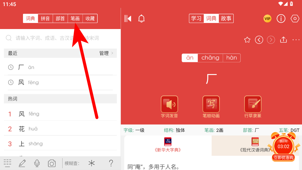1、在新華大字典界面,點(diǎn)擊上方筆畫選項(xiàng),進(jìn)入筆畫檢索頁(yè)面。