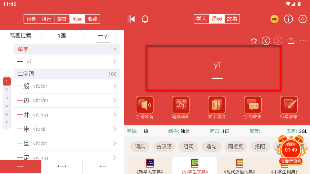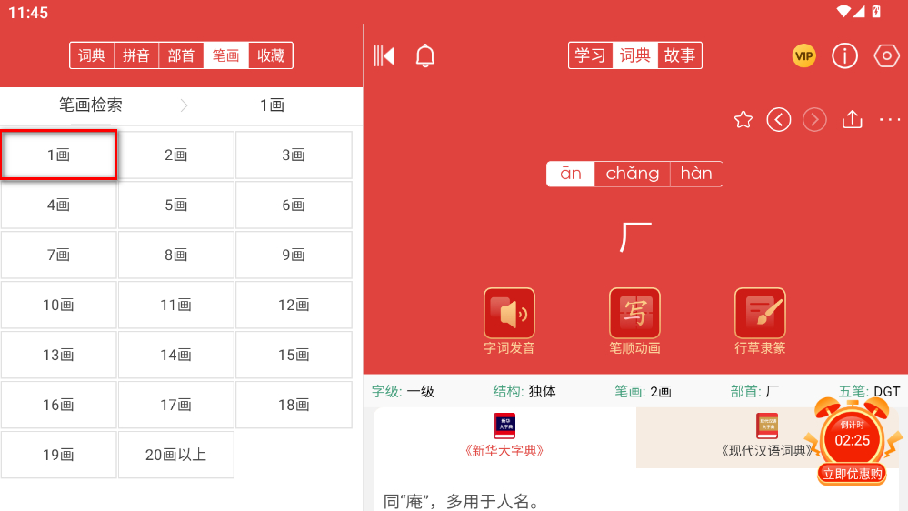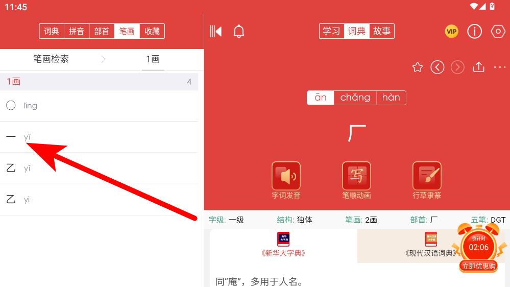 4、點(diǎn)擊后,即可查看該字的詳細(xì)信息,如發(fā)音、筆順等。