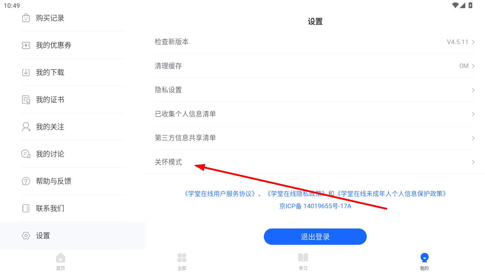 3、在設(shè)置界面里,找到并點擊關(guān)懷模式選項,進(jìn)入關(guān)懷模式設(shè)置頁面。