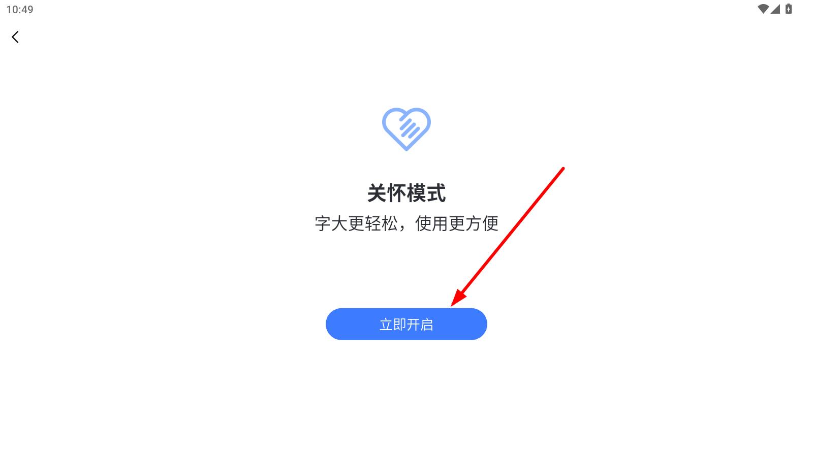 4、在關(guān)懷模式設(shè)置頁面,點擊立即開啟按鈕,即可成功開啟關(guān)懷模式。