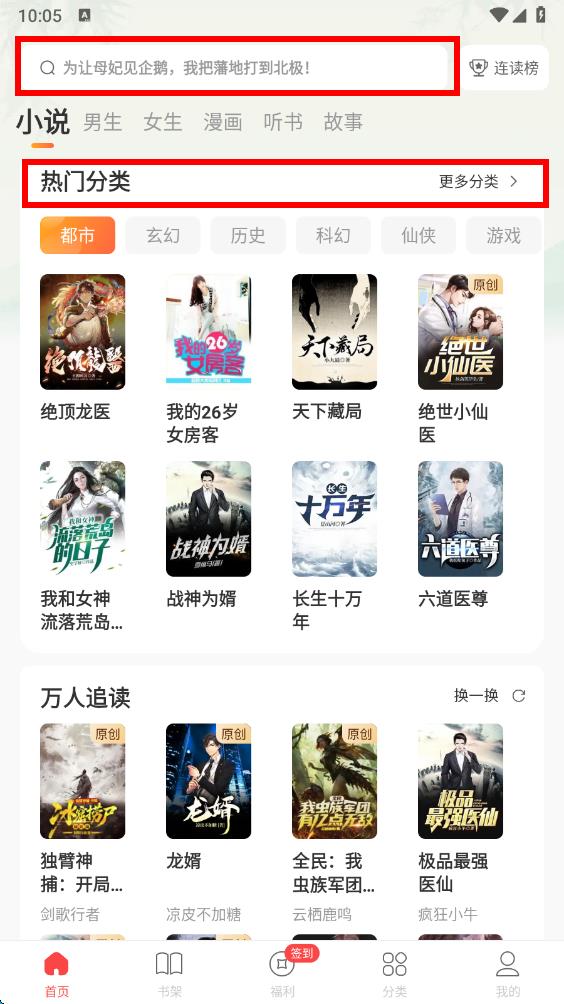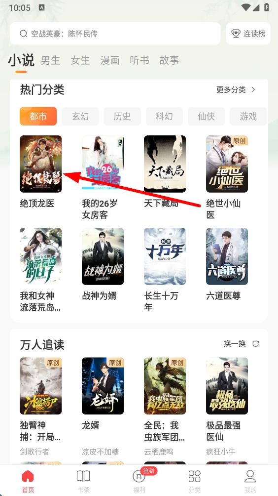 1、打開連尚讀書應(yīng)用,在首頁的熱門分類下,選擇感興趣的小說類別,或者直接在搜索欄輸入小說名,找到想要查看書評的小說。