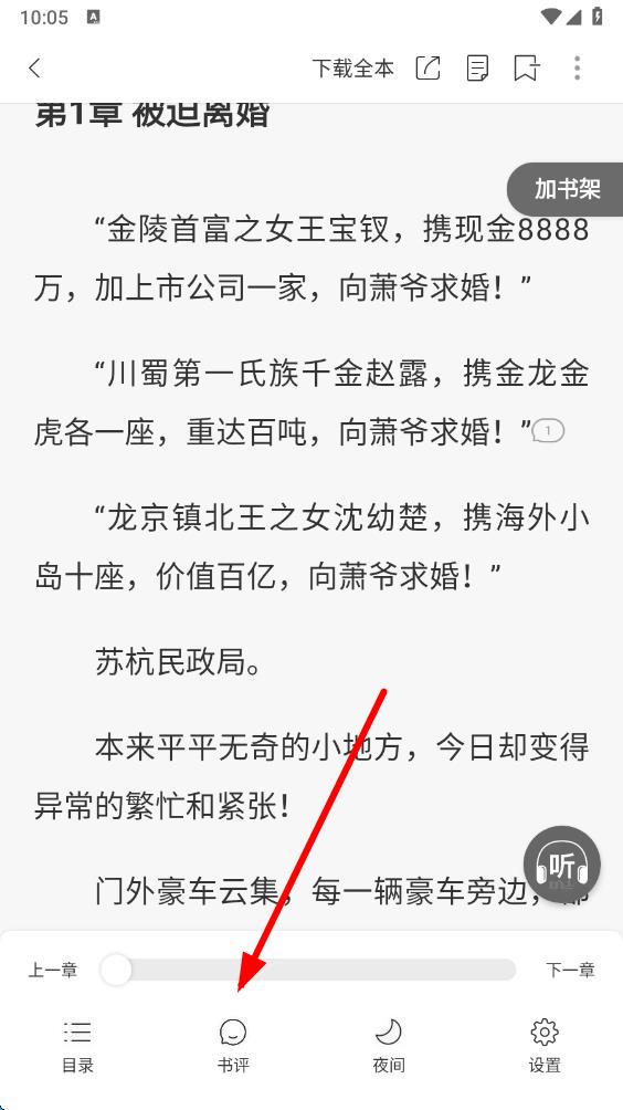 3、在小說閱讀界面中,點擊屏幕中間位置,喚出底部隱藏菜單,點擊菜單中的書評圖標(biāo)。