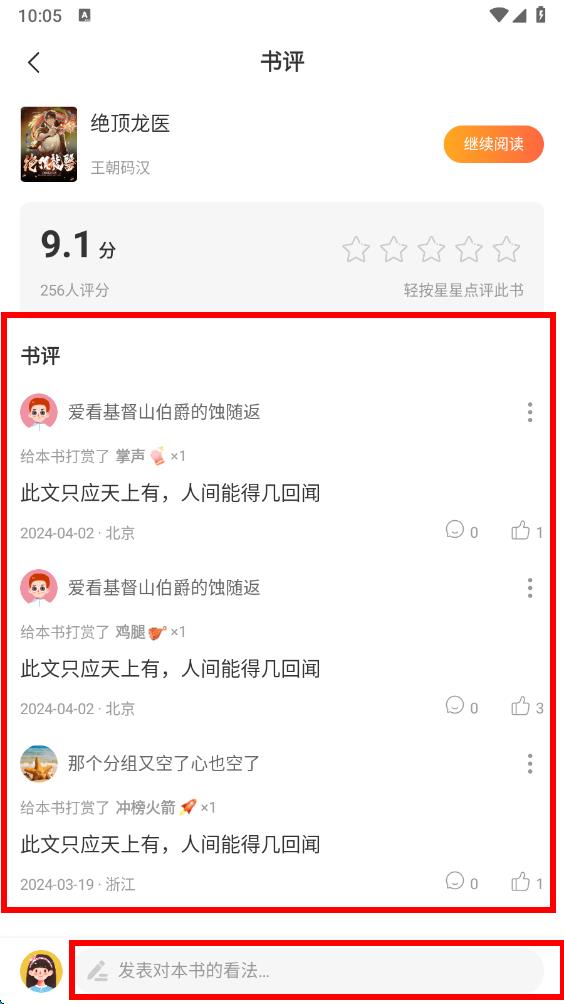 4、進(jìn)入書評頁面后,能看到其他讀者對該書的評分和評論內(nèi)容,若你也想發(fā)表書評,點擊頁面底部的輸入框,輸入內(nèi)容后發(fā)布即可。