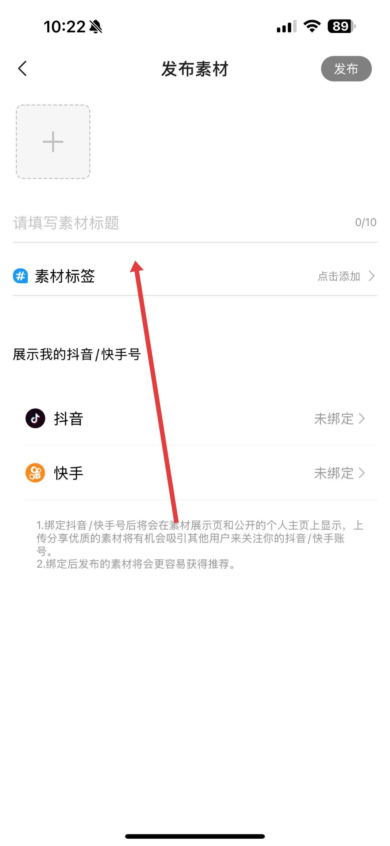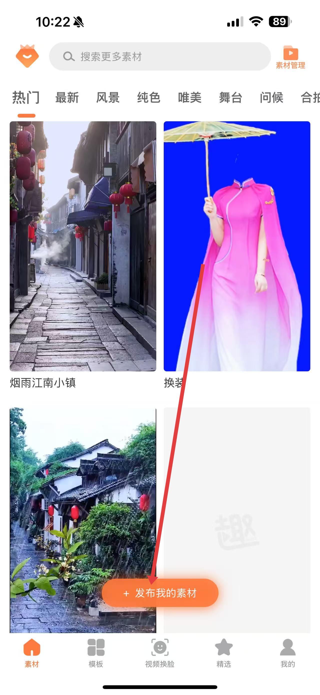 2、在素材界面里,找到并點(diǎn)擊下方的發(fā)布我的素材按鈕,進(jìn)入發(fā)布素材頁面。