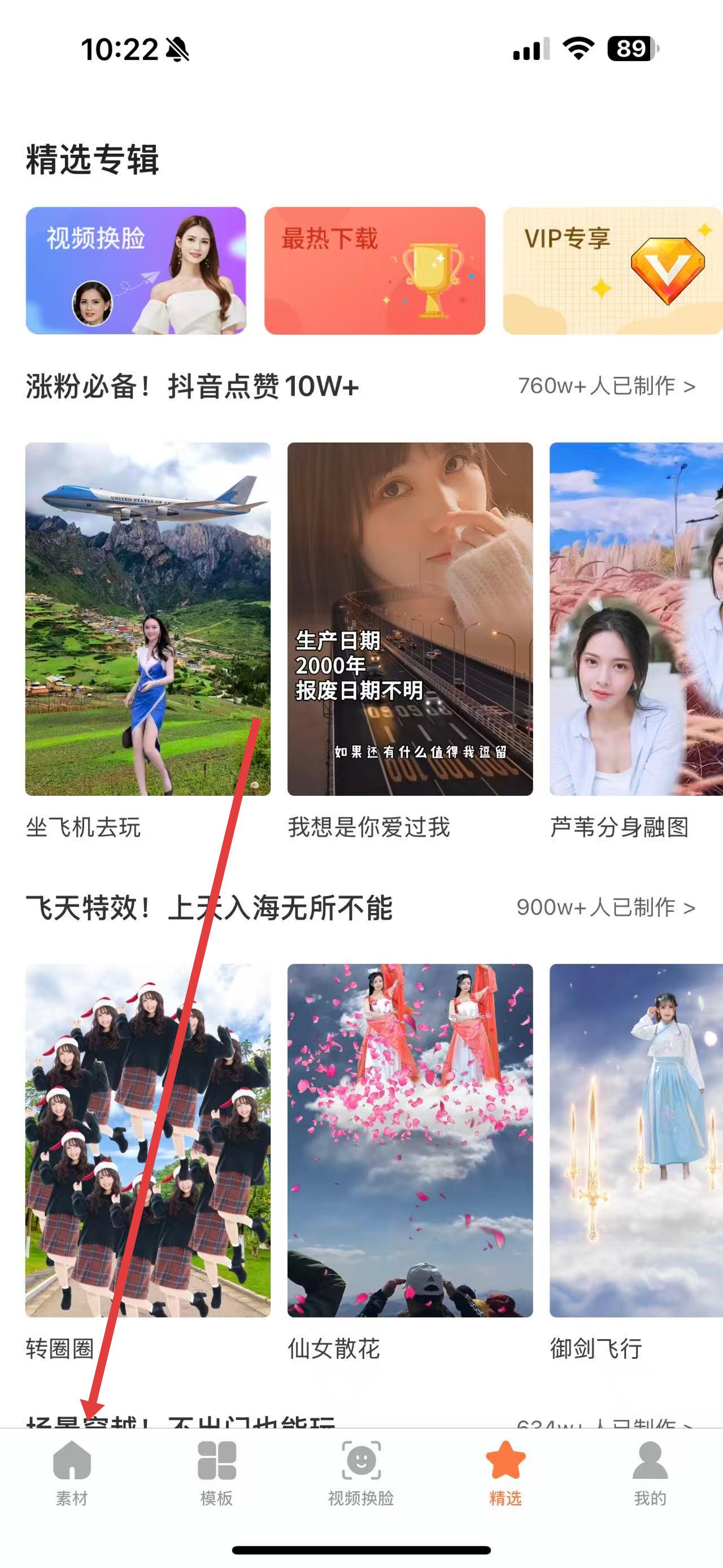 1、打開飛推APP,點(diǎn)擊底部導(dǎo)航欄中的素材按鈕,進(jìn)入素材界面。