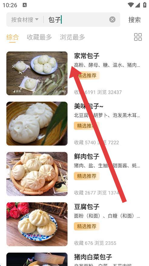 3、在搜索結(jié)果列表里,找到想收藏的菜譜,點擊進入菜譜詳情頁面。