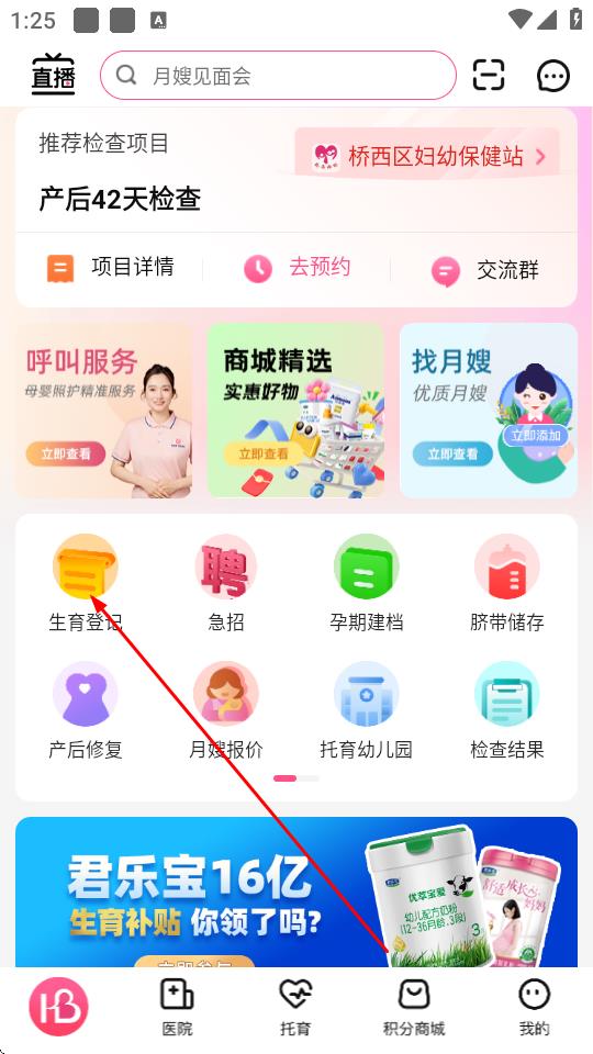 1、打開孕健康A(chǔ)PP,在首頁點(diǎn)擊生育登記圖標(biāo)。