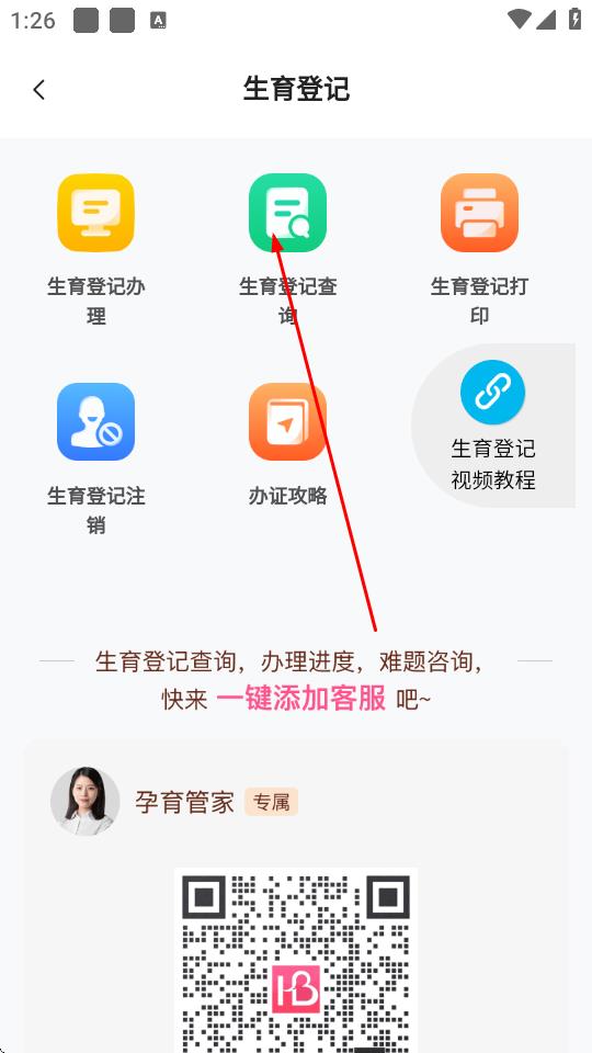 2、進(jìn)入生育登記頁面后,點(diǎn)擊生育登記查詢選項(xiàng)。