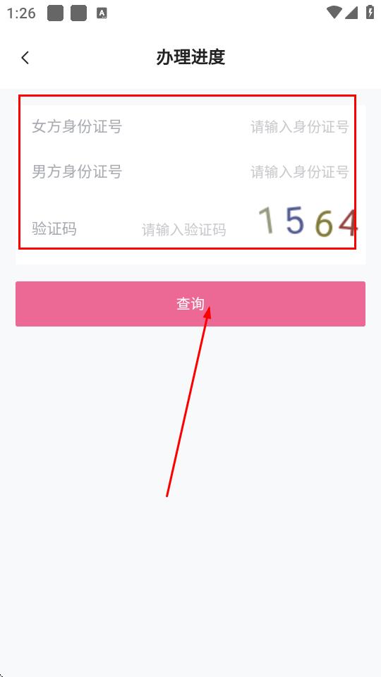 4、進(jìn)入辦理進(jìn)度查詢頁面,輸入女方身份證號(hào)、男方身份證號(hào)以及驗(yàn)證碼,點(diǎn)擊查詢按鈕,即可查看準(zhǔn)生證辦理結(jié)果。