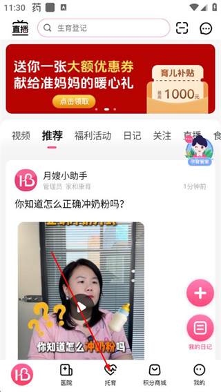 1、在孕健康A(chǔ)pp首頁點(diǎn)擊底部的托育,進(jìn)入托育機(jī)構(gòu)頁面。