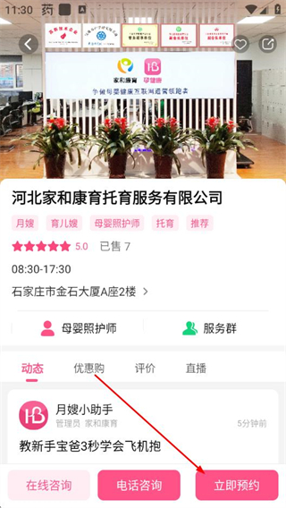 3、在機(jī)構(gòu)詳情頁面點(diǎn)擊立即預(yù),完成托育機(jī)構(gòu)檢查的預(yù)約流程。