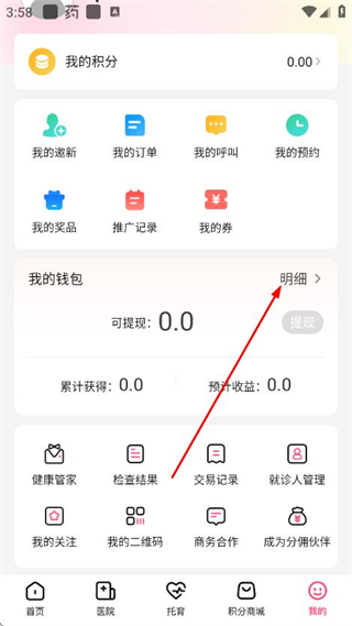 2、在個(gè)人中心頁面找到我的錢包板塊,點(diǎn)擊右側(cè)明細(xì)選項(xiàng),進(jìn)入錢包明細(xì)頁面。