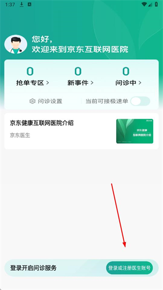 1、打開(kāi)京東醫(yī)生APP,點(diǎn)擊登錄或注冊(cè)醫(yī)生賬號(hào)。