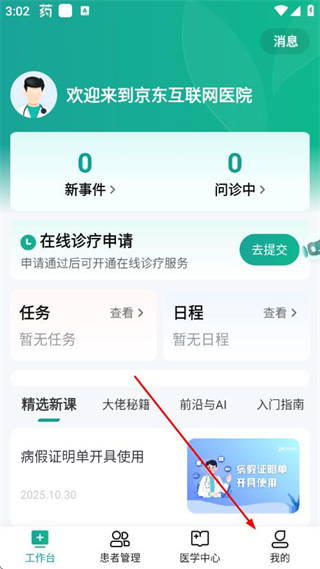 1、打開(kāi)京東醫(yī)生App的工作臺(tái)頁(yè)面,點(diǎn)擊底部的我的選項(xiàng),進(jìn)入個(gè)人頁(yè)面。