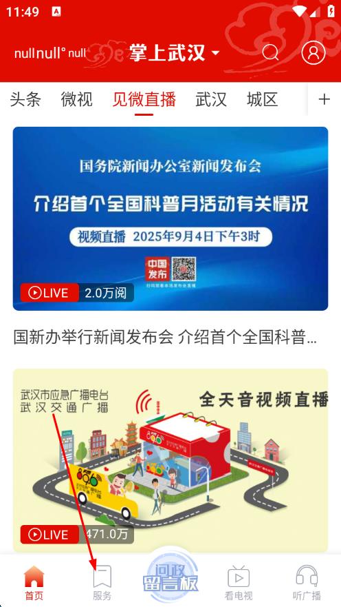 1、打開掌上武漢App,進入首頁,點擊底部導航欄中的服務選項。