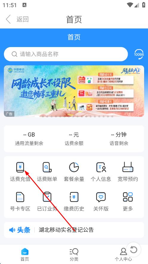 4、點擊電信運營商服務后,在首頁找到話費充值選項,點擊進入。