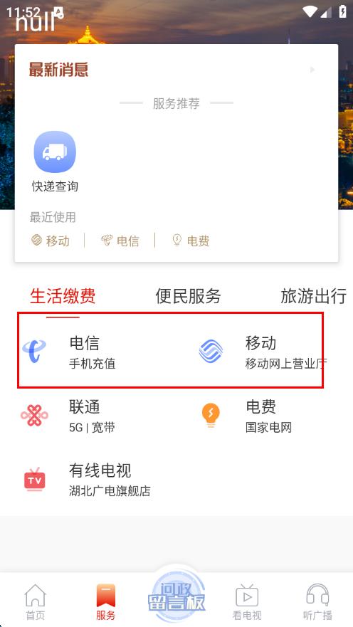 2、在服務頁面的生活繳費板塊,選擇對應的運營商服務,電信或者移動。
