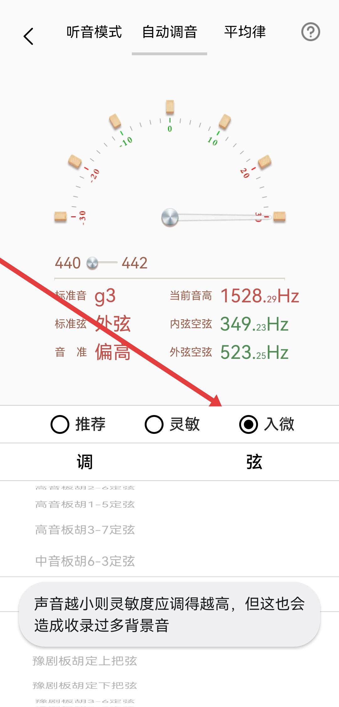 4、在自動(dòng)調(diào)音界面,根據(jù)音準(zhǔn)反饋調(diào)整樂(lè)器弦的松緊,并可選擇靈敏度模式,完成樂(lè)器調(diào)音。