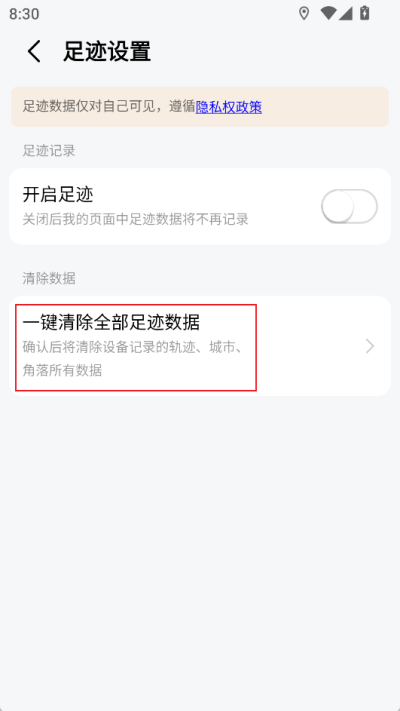 4、在足跡設(shè)置界面,點(diǎn)擊下方【一鍵清除全部足跡數(shù)據(jù)】選項(xiàng)即可將足跡刪除。