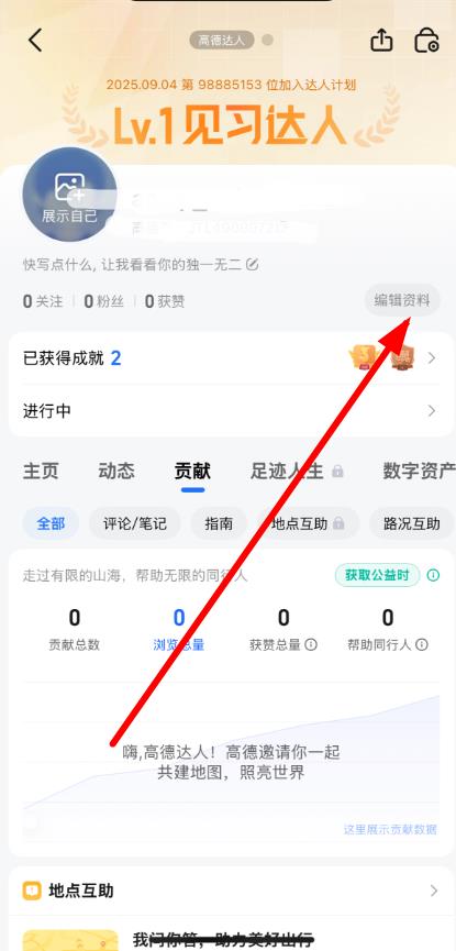1、打開高德地圖進(jìn)入個(gè)人主頁,點(diǎn)擊編輯資料選項(xiàng)進(jìn)入個(gè)人資料頁面。