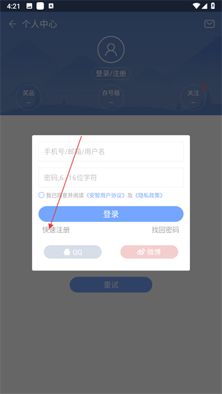 3、在登錄注冊(cè)界面,點(diǎn)擊快速注冊(cè)選項(xiàng),進(jìn)入安智賬號(hào)注冊(cè)頁(yè)面。