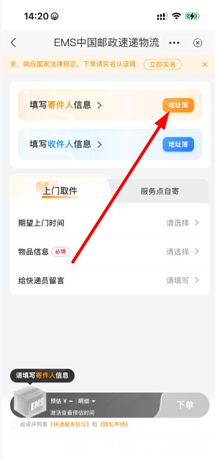 2、在寄件頁面,點(diǎn)擊填寫寄件人信息旁的地址簿,若地址簿無信息,點(diǎn)擊下方新建地址填寫寄件人地址等信息。