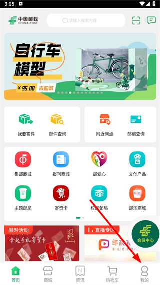 1、打開中國(guó)郵政app,點(diǎn)擊底部導(dǎo)航欄中的我的選項(xiàng)。
