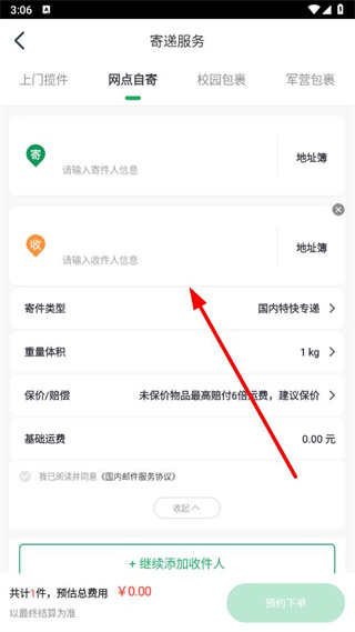 4、在寄遞服務(wù)頁面,填寫寄件人信息、收件人信息,選擇寄件類型、重量體積等信息后,點(diǎn)擊預(yù)約下單按鈕,完成預(yù)約下單操作。