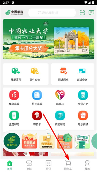 1、打開中國(guó)郵政APP,點(diǎn)擊下方購物車選項(xiàng)。