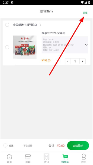 2、在購物車頁面中,點(diǎn)擊右上角管理選項(xiàng)。