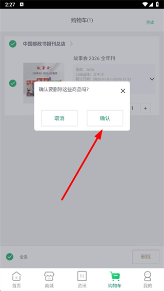 4、在彈出的確認(rèn)框中,點(diǎn)擊確認(rèn)按鈕即可刪除購物車中的商品。