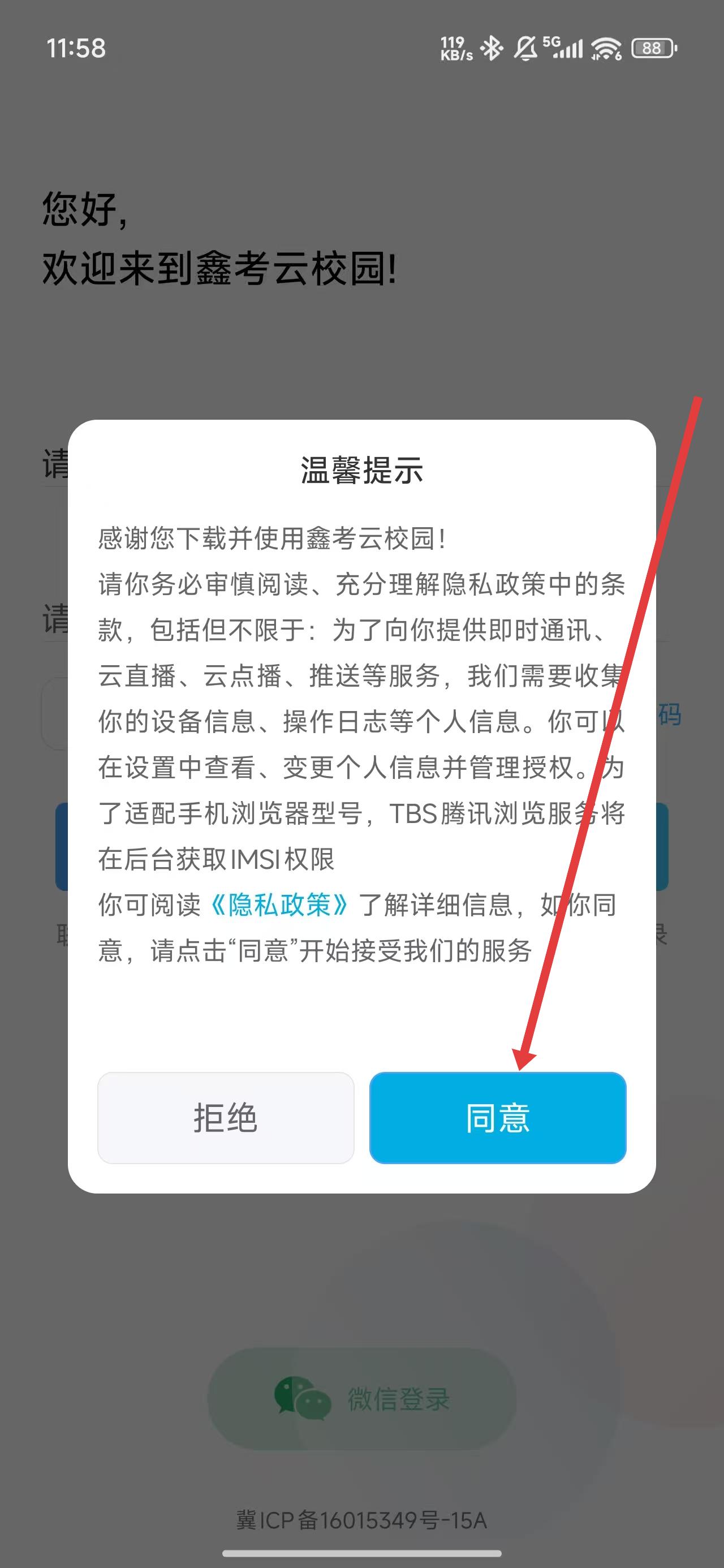 1、在進(jìn)入到鑫考云校園app后,可以點擊彈窗中的同意按鈕進(jìn)入使用app。