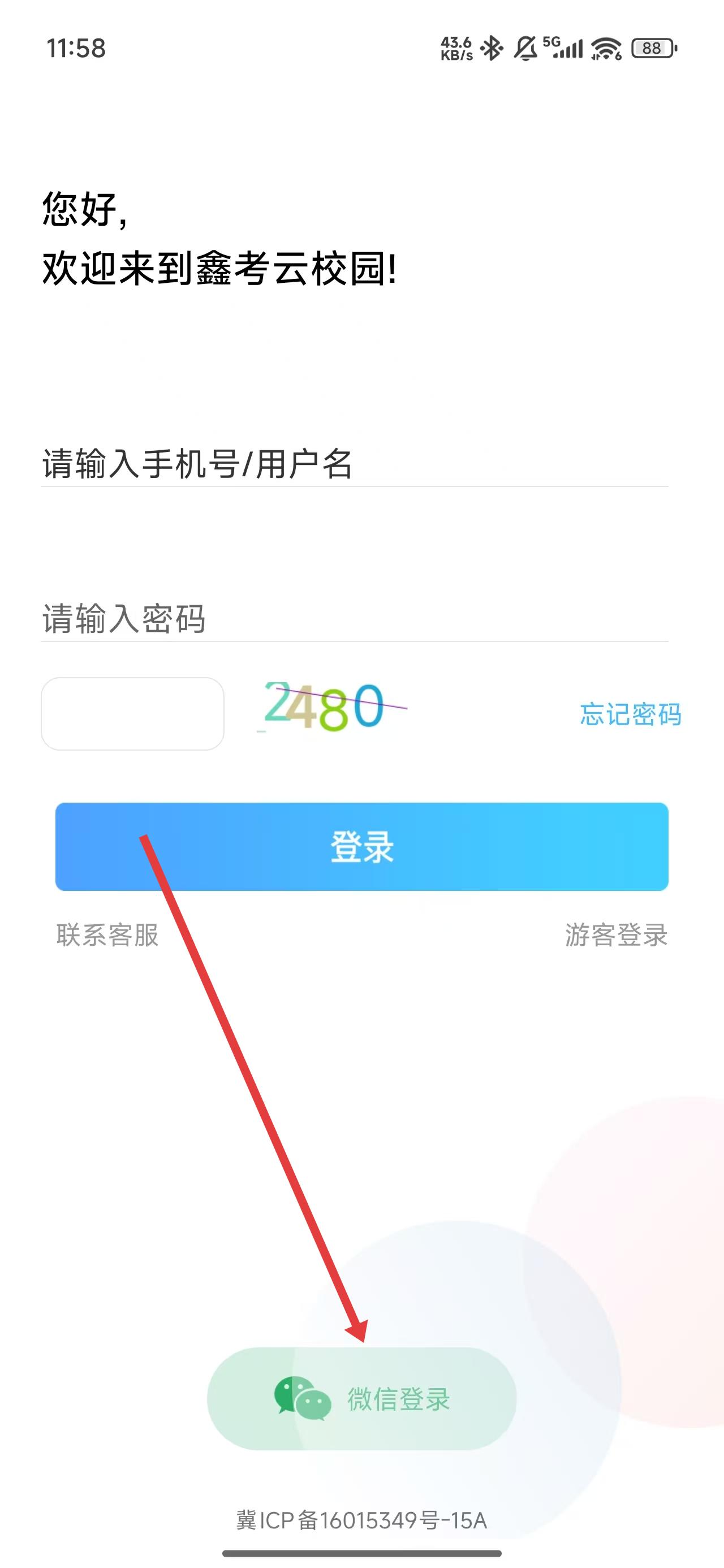2、在進(jìn)入到鑫考云校園登錄頁面時,可以點擊底部的微信登錄按鈕,使用微信登錄賬號。