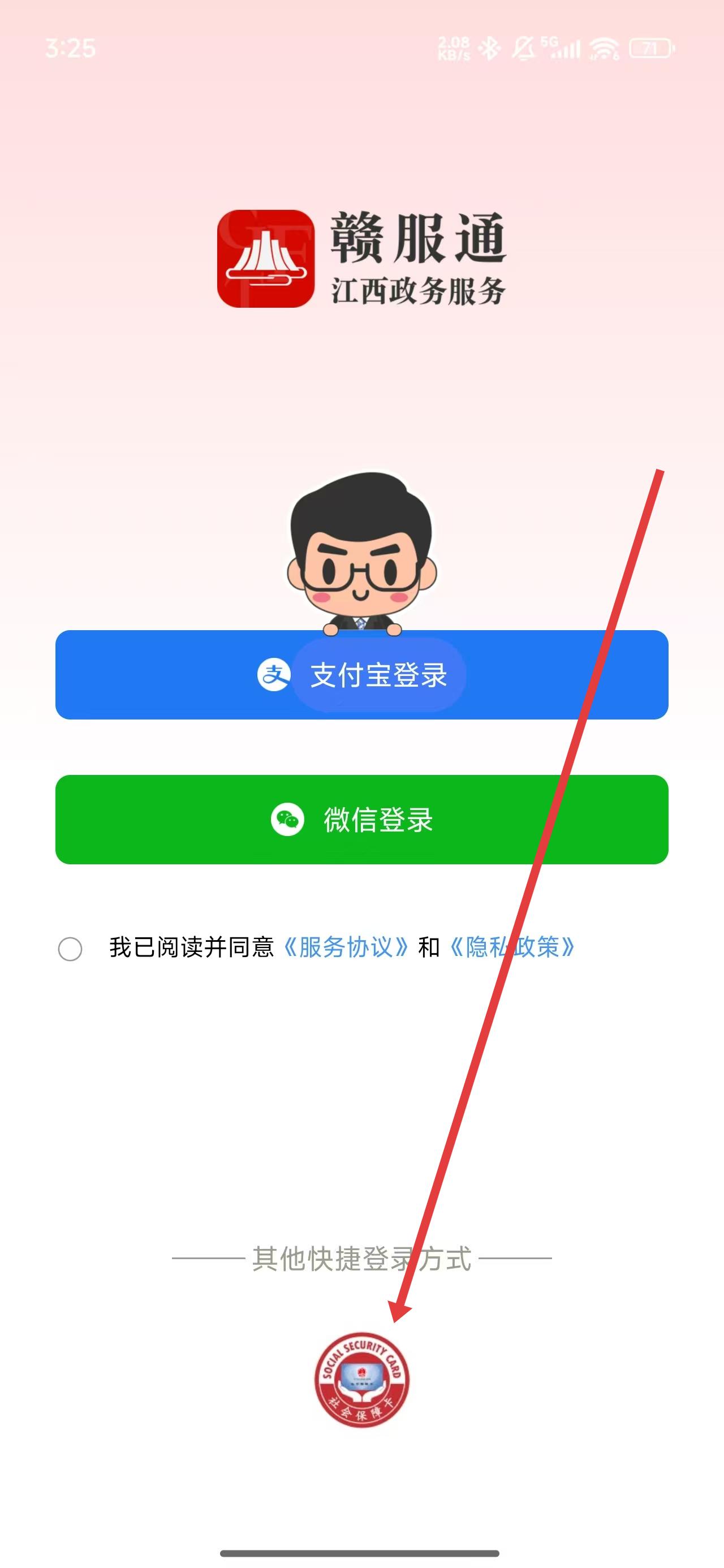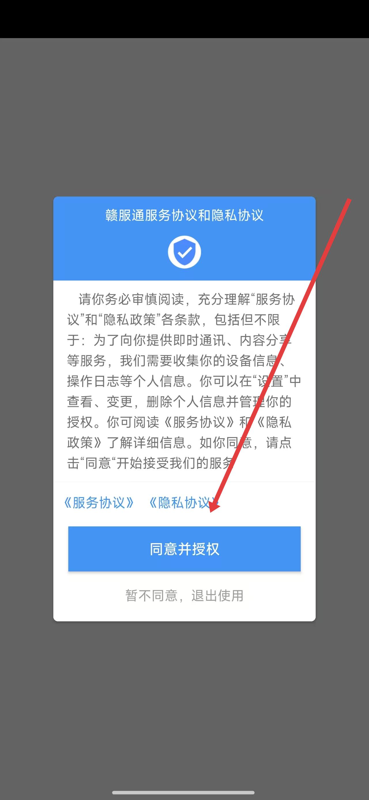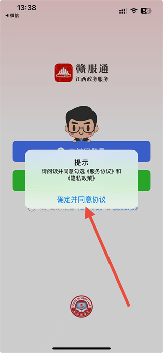 1、打開贛服通app后,點(diǎn)擊彈窗中的同意按鈕,進(jìn)入使用。