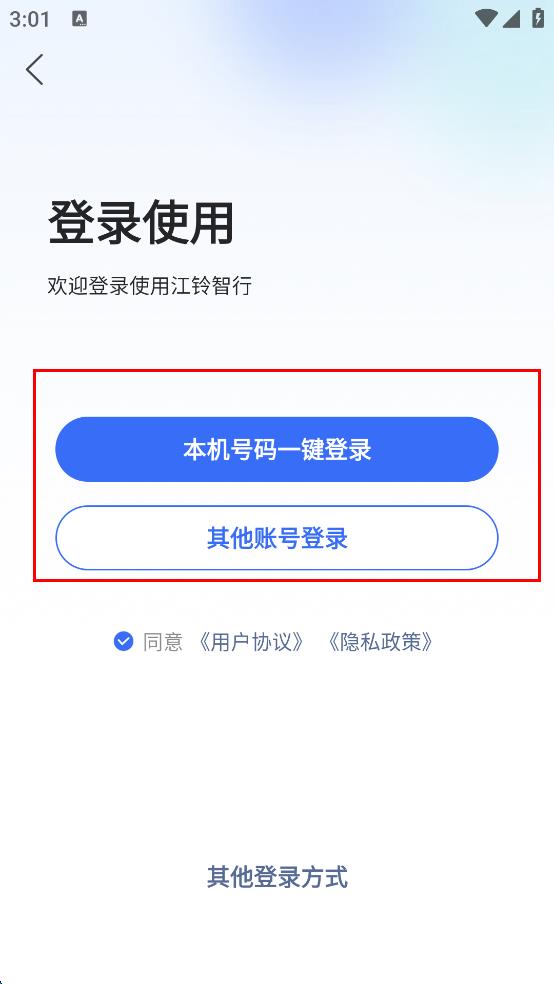 3、在登錄使用界面,勾選同意《用戶協(xié)議》《隱私政策》,然后選擇“本機號碼一鍵登錄”或“其他賬號登錄”,按照提示完成登錄流程,即可成功登錄江鈴智行APP。