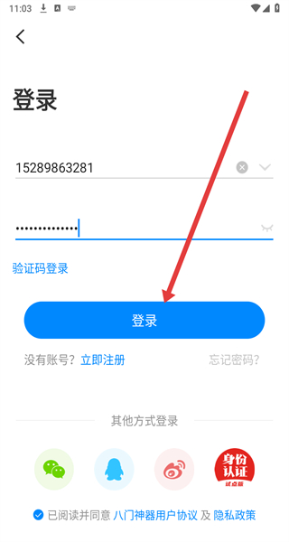 3、登錄界面輸入手機(jī)號,輸入密碼并勾選“已閱讀并同意八門神器用戶協(xié)議及隱私政策”。