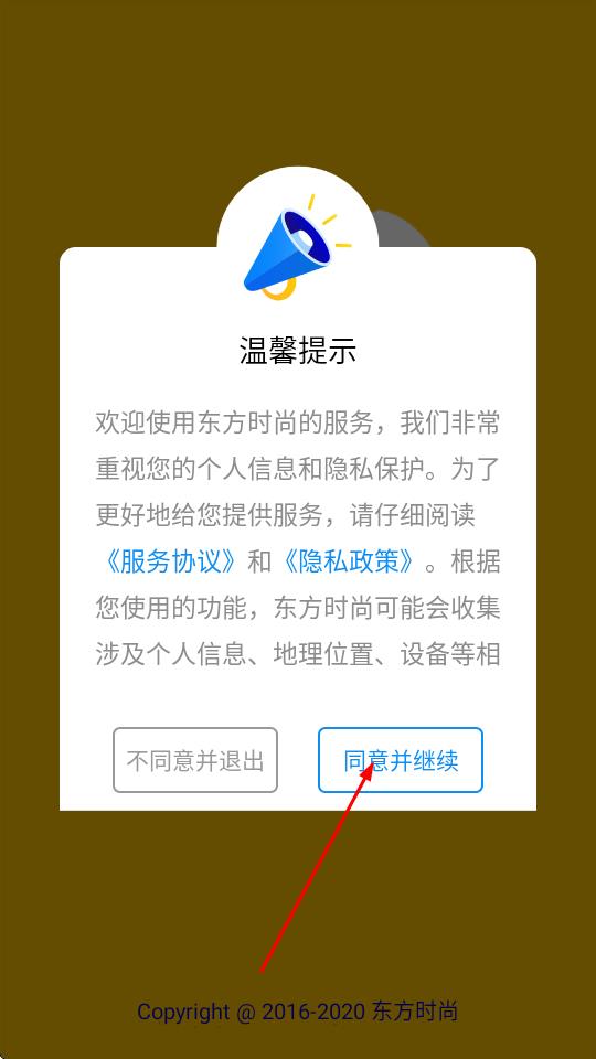 1、打開東方時尚會員俱樂部APP,在彈出的溫馨提示窗口中,點擊同意并繼續(xù)按鈕,進入APP主界面。