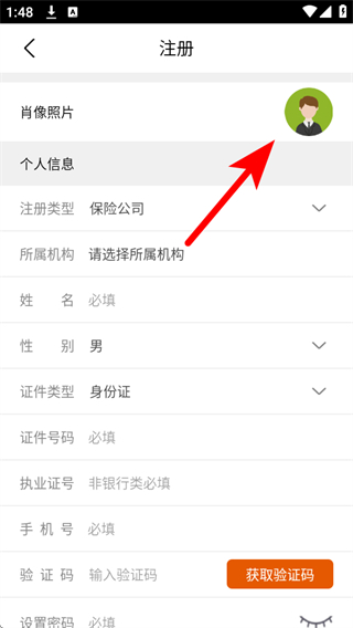 3、在注冊(cè)頁(yè)面上傳肖像照片,填寫個(gè)人信息,包括注冊(cè)類型、所屬機(jī)構(gòu)、姓名、性別、證件類型、證件號(hào)碼、執(zhí)業(yè)證號(hào)、手機(jī)號(hào)等。