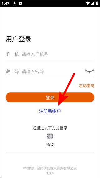 1、打開(kāi)保險(xiǎn)雙錄系統(tǒng)APP,在用戶登錄頁(yè)面點(diǎn)擊注冊(cè)新帳戶選項(xiàng)。