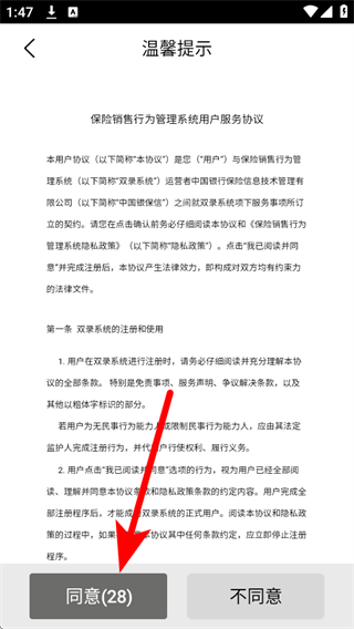 2、在溫馨提示頁(yè)面點(diǎn)擊同意按鈕,進(jìn)入注冊(cè)頁(yè)面。