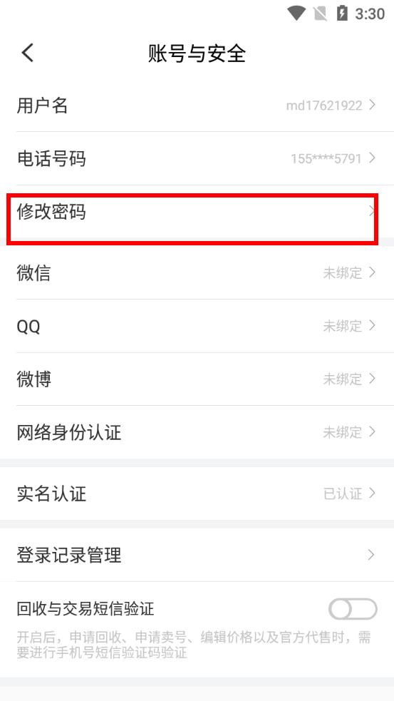 4、進(jìn)入賬號(hào)與安全頁面后,點(diǎn)擊修改密碼選項(xiàng)進(jìn)入操作即可。