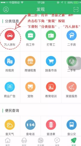 1.打開(kāi)“忠縣之家”APP點(diǎn)擊“發(fā)現(xiàn)”按鈕,下滑到“分類信息”,找到“萬(wàn)人拼車”