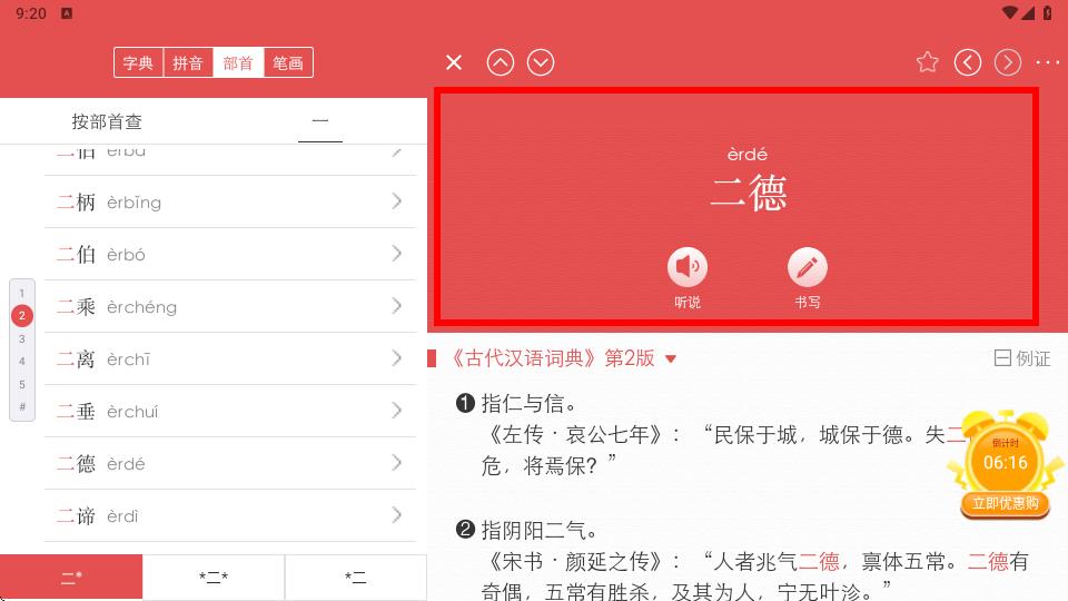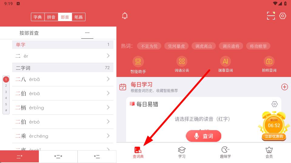 2、在查詞界面中通過拼音、部首等方式找到要查的詞語。